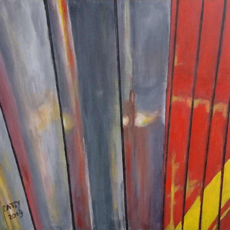 Eind vorig jaar had de woningbouwvereniging een brief gestuurd met de mededeling dat er plannen waren om iets met de flat te doen, een ingrijpende renovatie of zelfs sloop, wat het zou worden wisten ze nog niet. Dat was voor mij aanleiding om met andere ogen naar mijn huis te kijken, objectiever als het ware, zonder me te laten afleiden door de inhoud. Het resultaat daarvan was een serie foto’s van opmerkelijke details en bepaalde op de schildercursus mijn keuze van een jaarthema. Ik wilde van de meest aansprekende details een schilderij van 50 bij 50 cm maken. Toen ik ging verhuizen had ik er vier af, maar sinds maart ligt de voortgang van dit project stil door de coronamaatregelen.