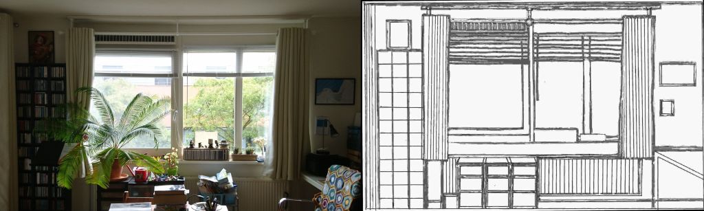 Ik maak regelmatig series waarin ik op een bepaald plaatje verschillende teken- en schildermateriaal uitprobeer om te kijken wat de effecten daarvan zijn, en een vereenvoudigde versie van dit uitzicht leek me daar ook wel geschikt voor. Daarom heb er daar een foto van gemaakt en die bewerkt tot een tekening in hoofdlijnen. Het ging me vooral om de rechte lijnen en vlakken, dus alle afleiding van planten, stapels boeken en ander los spul liet ik weg.
