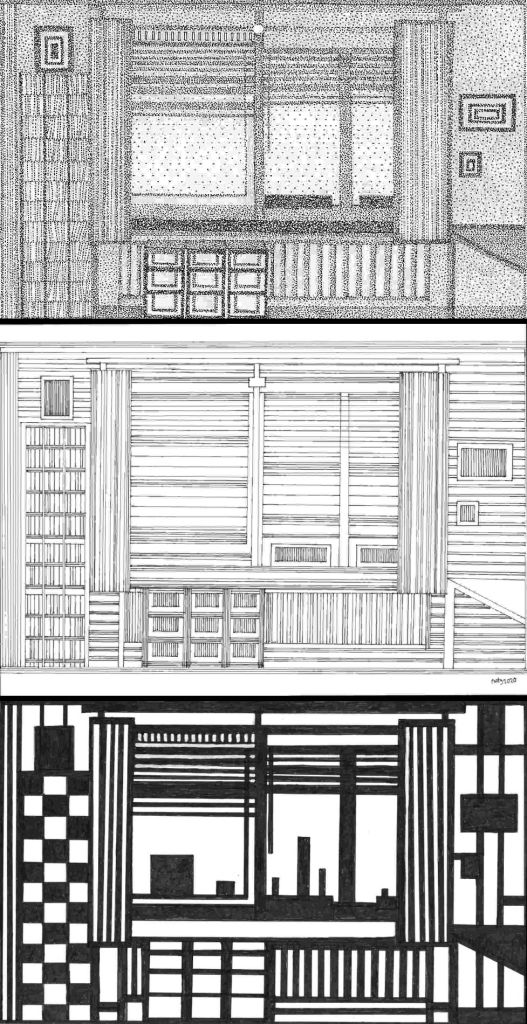 Dat heeft voorlopig geresulteerd in zes ‘werkjes’: drie zwart-wittekeningen: gestippeld met potlood en fineliner, gestreept met fineliner, en zwarte vlakken met een dikkere viltstift.