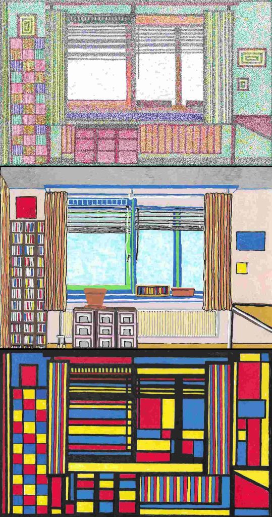Inmiddels ligt deze serie even stil, al heb ik nog wel een paar mogelijke uitwerkingen in gedachten. Het uitzicht is inmiddels wel veranderd, want nu het winter is zijn de gordijnen dicht als ik mijn oefeningen doe. Maar de ‘rommel’ die op de oorspronkelijke foto te zien is, ligt er ook nu nog steeds.