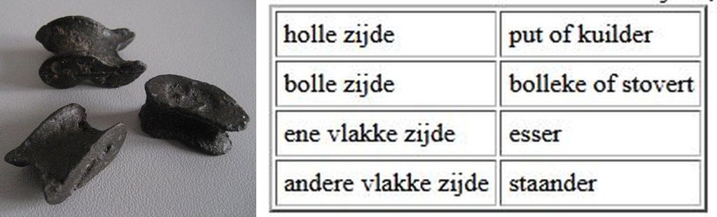 Die ‘zijkant van een koot of bikkel’ was nieuw voor me. Op de site piepstok.nl wordt het aloude bikkelspel omstandig uitgelegd. Je speelt het met een aantal bikkels (van steen of been, of plastic; oorspronkelijk was een bikkel het sprongbeen uit de achterpoot van een schaap) die je op allerlei ingewikkelde manieren omhoog moet gooien en weer opvangen. Zo’n bikkel heeft vier verschillende zijden, allemaal met een eigen naam die zeker een plaatsje lijkt te verdienen in de rubriek Woordenschat.