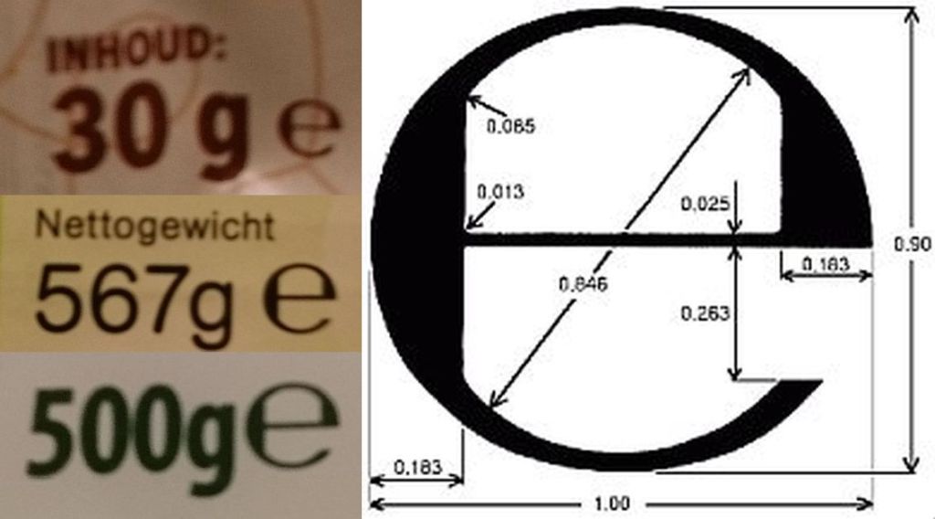 Je kunt het euro-symbool € zien als een gestileerde E en er zijn meer betekenissen die naar Europa verwijzen. Zo is het e-teken een gestandaardiseerde, gestileerde kleine letter e. Deze e staat op talloze voorverpakte waren en geeft de hoeveelheid aan volgens een genormeerd systeem. Ik heb altijd gedacht dat het een afkorting was van ofwel het Engelse estimated, ‘geschat’, ofwel het Franse environ, ‘ongeveer’, maar het blijkt een afkorting van ‘EEG-teken’, en geeft aan dat de hoeveelheid in de betreffende verpakking voldoet aan een Europese Richtlijn. Die richtlijn geeft marges aan waarbinnen de aangegeven hoeveelheid moet vallen. Het getal achter de e is dus een gemiddelde. Als er bij de inhoud geen e-teken staat moet de aangegeven hoeveelheid er minimaal in zitten.