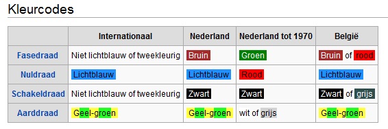 Een nuttige en belangrijke code is N in de betekenis ‘neutraal’ of ‘nul’ bij elektrische bedrading. De betreffende draad is blauw gekleurd.