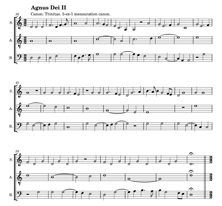 Ik vond het vooral interessant hoe dit genoteerd werd: als een te ontrafelen puzzeltje. Als voorbeeld van zo’n melodie, in dit geval met drie stemmen op één regel, kregen we een plaatje van het tweede deel van het ‘Agnus Dei’ uit de Missa L’homme armé super voces musicales van Josquin DesPrez te zien: