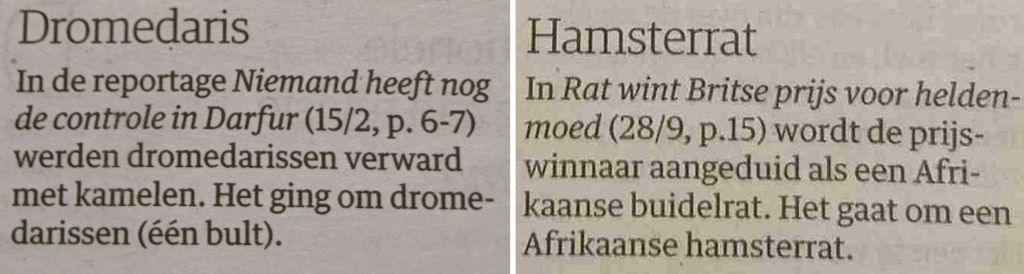 In 2020 heb ik de rubriek ‘Correcties en aanvullingen’ in de NRC enige tijd extra aandachtig gelezen en in een map op de computer bewaard. Ik was nieuwsgierig welke de fouten de krant zoal maakte. Dit ‘project’ raakte wat op de achtergrond, maar onlangs las ik een correctie die me ertoe bracht weer eens in die map te kijken.