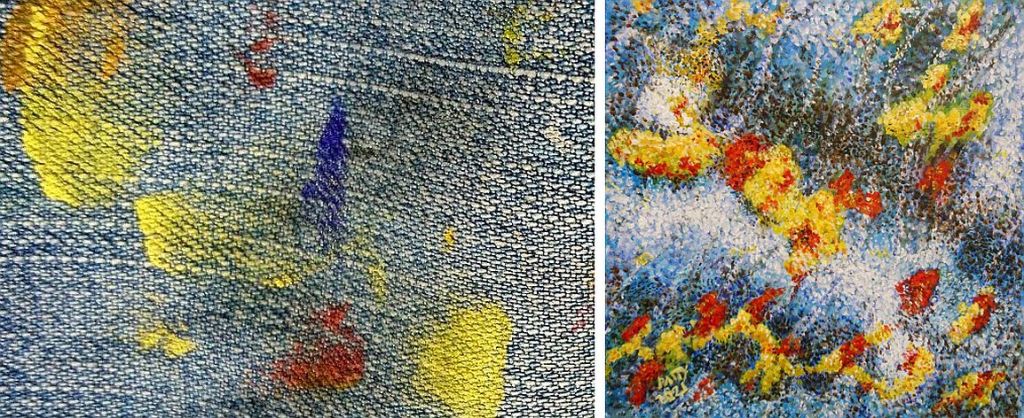 Ik was op dat idee gekomen door een opdracht op de schildercursus om een schilderij te maken met het thema ‘vlek’, waarvoor ik vlekken op mijn schilderbroek had gebruikt.