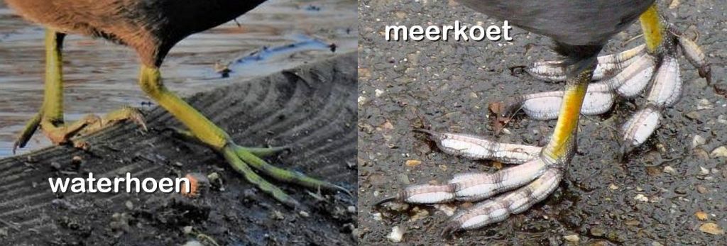 Verder hebben meerkoeten zwemvliespoten – ‘grote blauwgroene poten met gespreide zwemlobben’ – en waterhoentjes niet. Op deze plaatjes zie ik eigenlijk geen zwemvliezen van de meerkoet, maar ze verschillen duidelijk van elkaar. In het echt zie ik die poten nauwelijks, want meestal liggen de vogels op hun nest of zwemmen ze in het water.