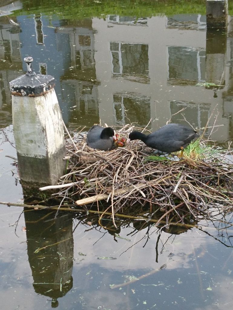 Elk jaar zie ik die vogels in het voorjaar op hun nest zitten en vaak maak ik er meteen een foto van, want het is zo’n schattig gezicht. Als ik een paar weken later de kuikentjes met hun rode koppies achter vader en moeder aan zie zwemmen, schril piepend zodra ze wat zijn afgedwaald, denk ik: zijn het nou meerkoeten of waterhoentjes?