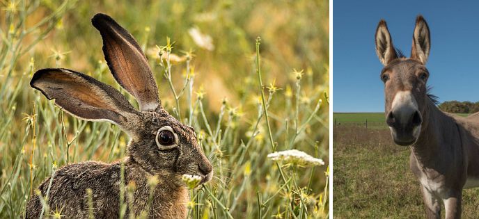 In de omschrijving stond dat dit een combinatie was van jackass en rabbit. Een rabbit is een konijn, dat wist ik nog wel, maar jackass moest ik opzoeken: dat blijkt een ezel te zijn. Een jackrabbit is dus een konijn met ezelsoren. Dat beest wordt in het Engels echter ten onrechte zo genoemd, want het is eigenlijk een haas. De Nederlandse vertaling is ‘prairiehaas’.
