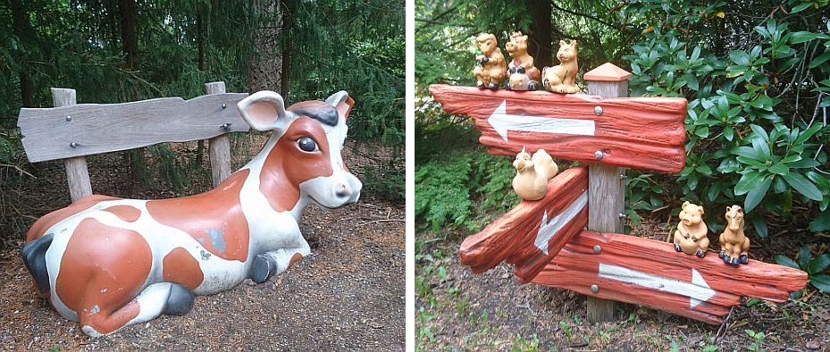 Wat me in het park zelf vooral opviel waren de wegwijzers: allerlei pijlen, maar nergens stond aangegeven waar ze naartoe wezen. Wel zaten er allerlei beeldjes van schattige beesten op. Leuk voor kinderen, dacht ik. Af en toe stond naast het pad een grote uitvoering van zo’n dier. Onder meer deze koe.