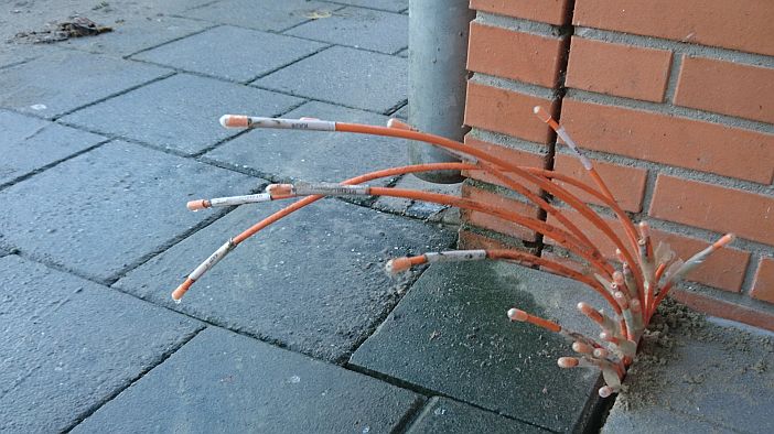 Ze zijn hier nu bezig met het leggen en ingraven van de kabels. Bij mijn flat liggen ze inmiddels onder de grond tot aan de ingang en hebben we naast de brievenbussen een leuk tegeltuintje met oranje sprieten. Uiteindelijk krijgen we daarmee allemaal ‘toegang tot het snelste netwerk van Nederland’, oftewel snel internet.