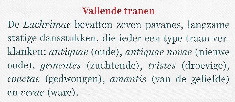 Toen het stuk al zo goed als af was las ik in het Tijdschrift Oude Muziek een artikel over de bundel Lachrimae (‘Tranen’)* van de zestiende-eeuwse componist John Dowland. De stukken uit die bundel vertegenwoordigen elk een bepaald type traan; zo verwijst het deel met lachrymae antiquae, oude tranen, naar Dowlands eerdere luitlied Flow my Tears. Daarover wordt opgemerkt: ‘Vallende tranen worden plastisch verklankt met een dalende reeks van vier tonen. Daarna maakt de melodie een affectieve sprong omhoog om vervolgens opnieuw vier stappen te dalen.’