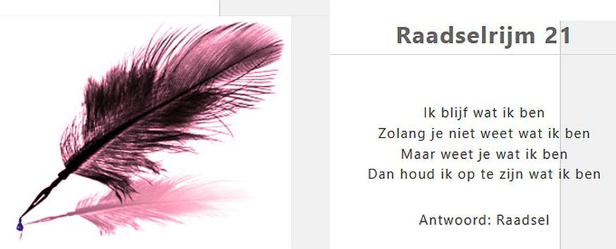 Bij een korte zoektocht naar raadselrijmpjes en -versjes op internet kwam ik eerst terecht op een site voor kinderen waar werd uitgelegd wat het zijn: ‘Een raadselrijm is een soort gedicht. In het gedicht staat een raadsel dat je moet oplossen.’ Het voorbeeld dat daarbij stond snapte ik gelukkig wel: