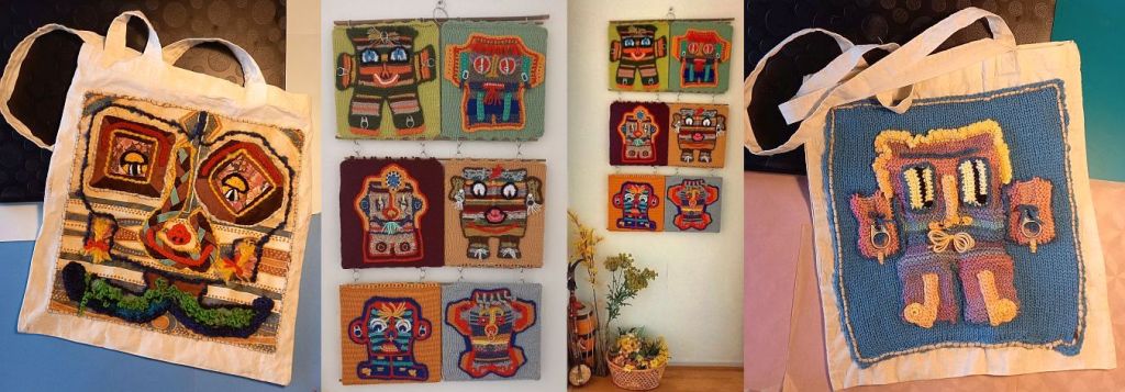 Inmiddels heb ik namelijk al meer dan tien ‘platte Eppies’ gemaakt en zeven ‘bolle Eppies’, een soort zachte knuffels. Zes van de platte Eppies met een afmeting van dertig bij dertig centimeter 30×30 cm heb ik verwerkt in een soort ‘modulair’ wandkleed dat in theorie uitgebreid kan worden voor een veel grotere wand. Met de huidige afmeting past het goed in de gang. Andere platte Eppies vinden een bestemming als vrolijke applicatie op een katoenen tas.