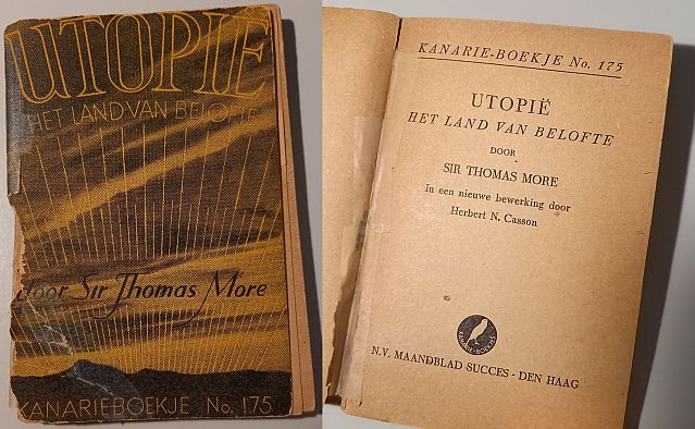 Het boekje dat ik had gekocht was nummer 175, met de titel Utopië. het land van belofte door Sir Thomas More (1947). Het had slechts 64 bladzijden, dus het is vast geen getrouwe vertaling van het beroemde Utopia uit 1516, want het oorspronkelijke boek uit 1516 telt 186 pagina’s en in de vertalingen varieert het aantal van 160 tot 180. Zelfs het lemma van Utopia in Wikipedia met een samenvatting van de inhoud is al vrij omvangrijk, met meer dan tien bladzijden A4. Het bleek te gaan om een ‘nieuwe bewerking door Herbert N. Casson’.