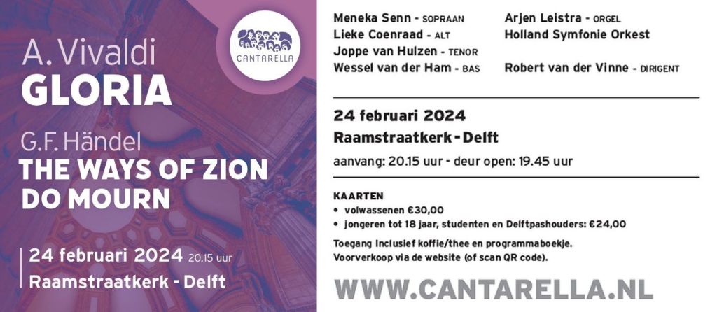 Op de fraaie datum 24-02-2024, oftewel zaterdag 24 februari, geeft Cantarella haar eerste concert onder leiding van onze nieuwe dirigent Robert van der Vinne. Komt dat zien en (vooral) horen! Het vindt plaats in de Raamstraatkerk in Delft (die officieel de Franciscus en Clarakerk heet, maar door niemand zo wordt genoemd). Het begint om kwart over acht en de deur gaat open om kwart voor acht. Zie voor meer informatie en het bestellen van kaarten de website van Cantarella.