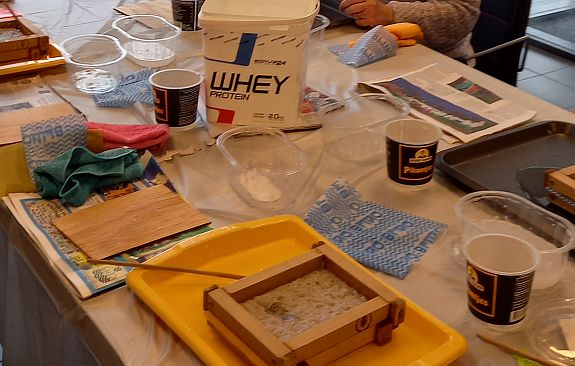 Stap voor stap legde de workshopleidster Patricia Ringeling uit hoe we te werk moesten gaan om van oud papier nieuw papier te maken, op een zo milieuvriendelijk mogelijke manier. Als basismateriaal gebruikten we papier dat je normaal bij het oud papier dumpt, zoals het ribbeltjeskarton van rollen beschuit, verpakkingen van theezakjes en belastingenveloppen. Dat restpapier scheur je in kleine stukjes die je in een bepaalde verhouding in een bakje water gooit en goed door elkaar roert. Wij werkten met 5 gram papier op 300ml water voor een papiertje van A6-formaat.