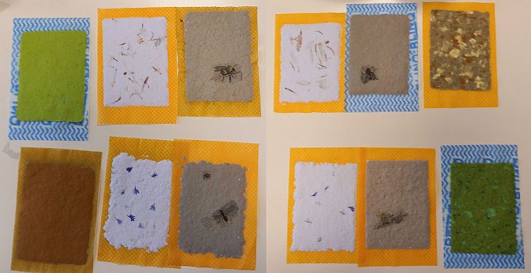 Na twee uur hadden we alle vier drie verschillende velletjes A6 gemaakt: één met gedroogde bloemblaadjes, één met een klein plaatje en één waarvoor we gekleurd papier hadden gebruikt. Het resultaat is steeds een verrassing. Mijn plaatje, een slak, kwam niet ongeschonden door, maar de insecten van de anderen waren prachtig. Het duurt vrij lang voordat het papier echt droog is, maar goed ingepakt konden we onze resultaten na afloop mee naar huis nemen, waar ze verder kon drogen.