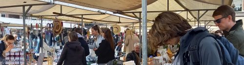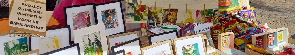 Van de rest van de markt hebben we niet veel gezien, want we konden onze kraam natuurlijk niet in de steek laten. Ingrid draaide keer op keer geroutineerd haar win-win-win-verkoopriedeltje af over het goede doel: de duurzame schorten voor De Bieslandhof van hergebruikt materiaal, die gemaakt gaan worden door een bedrijf waar mensen werken ‘met afstand tot de arbeidsmarkt’, en over de schilderijtjes van kartonnen schilderpaletjes die de deelnemers aan de schilderactiviteit hebben gebruikt. Dat verhaal hield ze zowel in het Nederlands als in het Engels.