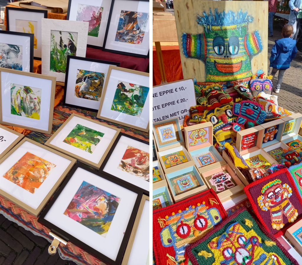 ’s Morgens waren Ingrid en ik keurig op de aangegeven tijd op de markt, om half elf, om onze kraam in te richten. De verkoop mocht pas om twaalf uur beginnen. Links lagen en stonden de schilderijtjes van Ingrid en rechts mijn Malle Eppies. Het resultaat was een kleurrijke, aantrekkelijke blikvanger, vonden we zelf.