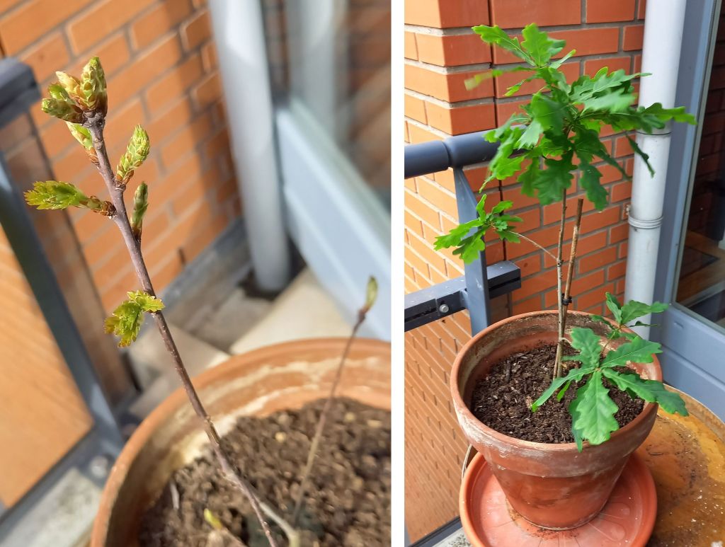 Ook de eik heeft de winter goed doorstaan. Hij was natuurlijk helemaal kaal geworden, maar dat doen loofbomen nu eenmaal, dus daarover heb ik me geen zorgen gemaakt. Zodra het langer licht werd en de temperatuur ging stijgen liep hij uit en kreeg hij steeds meer nieuwe blaadjes.