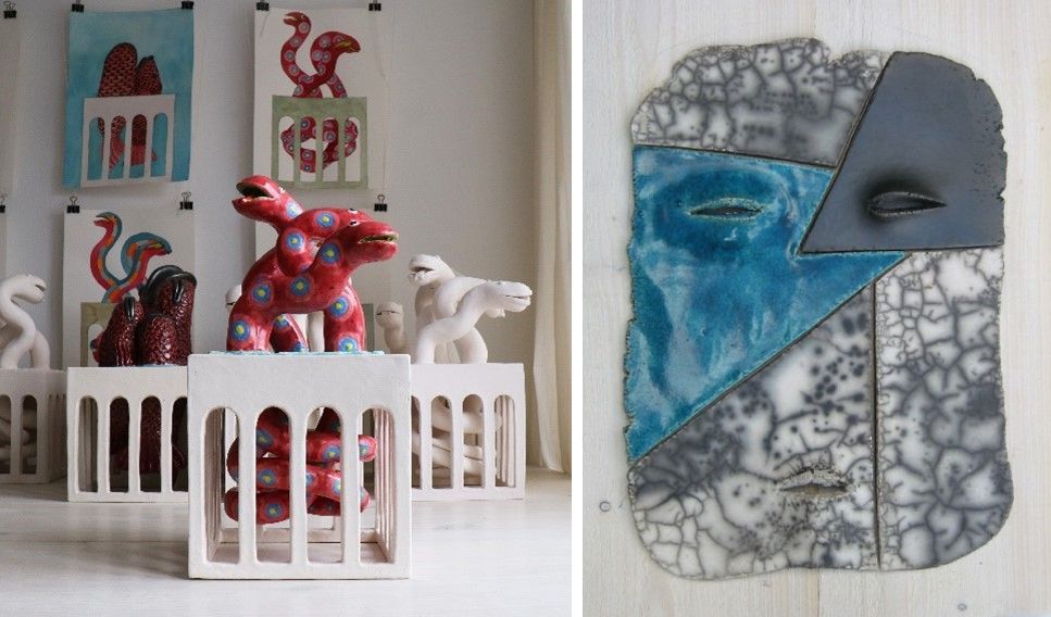 De objecten varieerden van strakke geometrische vormen tot een verzameling barokke Mariabeeldjes die een catalogus van glazuurkleuren verbeeldden, en van tempels met vrijheid zoekende slangen tot raku-gestookte wandobjecten, zeedieren en vogels.