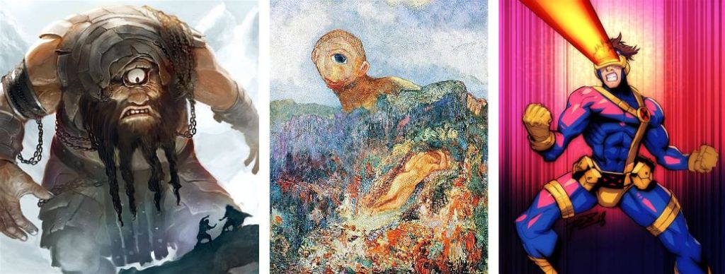 Het woord ‘cycloop’ komt van het Oudgriekse kúkloops, oftewel ‘rondoog’: kúklos = cirkel en oops=oog. Volgens de overlevering woonden deze eenogige reuzen op de hellingen van de Etna, waar ze schapen hoedden. Deze mythologische wezens zijn door uiteenlopende kunstenaars verbeeld.  In de televisieserie die bij de cursus werd vertoond zag hij er met een soort rubberen masker op nogal  knullig uit en op andere afbeeldingen zie je vaak nog waar ‘gewone’ ogen zitten. Toch zijn er ook veel mooie plaatjes van cyclopen te vinden, al dan niet gebaseerd op het verhaal uit de Odyssee. Ze variëren van meer of minder angstaanjagende monsters tot een bedeesd ogende cycloop op het schilderij van Odilon Redon. De cycloop is een van de talloze superhelden van Marvel. Ook Sinbad de Zeeman, een personage uit de vertellingen van 1001 nacht – wiens avonturen niet voor die van Odysseus onder doen – komt op een van zijn reizen op een cyclopeneiland terecht.