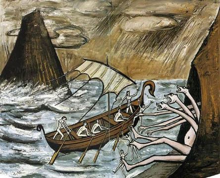 Odysseus vertelt zijn mannen niet wat hun te wachten staat, maar toen ze allemaal doodsbang naar de draaikolk Charybdis keken, ‘graaide en greep uit mijn welvende vaartuig Scylla intussen/ zes van mijn mannen, mijn sterkste en handigste varensgezellen’.