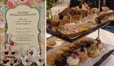 Eind november waren alle vrijwilligers van De Bieslandhof uitgenodigd voor een High Tea, als blijk van waardering voor onze inzet. Zoiets laat ik natuurlijk niet aan me voorbijgaan en gelukkig konden ook de meeste anderen van ons schilderteam zich op die dinsdagmiddag vrijmaken. Op feestelijke étagères kregen we een keur aan lekkere zoete en hartige hapjes voorgeschoteld, zoals soesjes, brownies en minisandwiches.