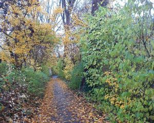 Ik vond het altijd plezierig om over het voetpad omhoog naar de brug te lopen. Dat ligt naast de drukke verkeersweg met de trambaan en wordt daarvan gescheiden door struiken en hoge bomen. Zoiets geeft me een beetje een vakantiegevoel. Als ik het verkeersgeluid weg dacht lukte het soms om me voor te stellen dat ik in een bos liep.