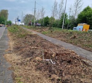 Door de werkzaamheden had ik de laatste tijd die route niet vaak genomen. Maar op tweede paasdag liep ik weer eens die kant uit om te zien hoe het ervoor stond. Ik schrok me rot!  Alles was weg, alle struiken, alle hoge bomen. Ik wist dat vorig jaar augustus een van die bomen tijdens een storm was omgevallen, bovenop een paar geparkeerde auto’s. Misschien waren al die bomen wel ziek geweest van binnen en was het kappen onvermijdelijk, maar van deze rigoureuze kaalslag ben ik best geschrokken.