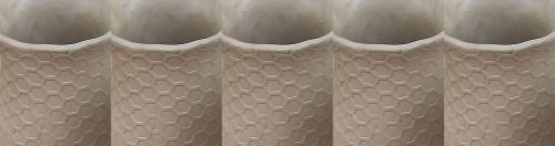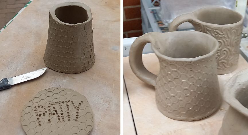 Ik had hem een honingraatpatroon gegeven. Voor het aanbrengen van dergelijke patronen zijn er speciale hulpmiddelen, een soort mini-deegrollers. Er waren best veel deelnemers en om te weten welke mok van wie was prikten we in de bodem met een satéprikker onze naam.