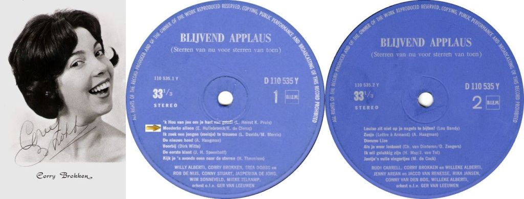 En nu lag daar dat vergeelde boekje met de noten van de melodie en de tekst van de drie coupletten. Thuis ging ik op de computer verder op zoek. De uitvoering door Corrie Brokken vond ik terug op YouTube. Conclusie: je moet ervoor in de stemming zijn, zal ik maar zeggen. Op de LP Blijvend Applaus staat Moederke Alleen op kant A en op YouTube stond alleen de B-kant. Die heeft nog meer van die liedjes met een hoog nostalgisch gehalte, bijvoorbeeld de al even larmoyante smartlappen ‘Zusje’ en ‘Het antwoord van zusje’ (Corrie Brokken en Willeke Alberti), en ‘Jantjes Vuile Vingertjes’ (Willeke Alberti).