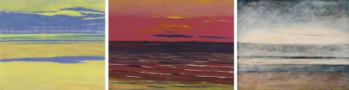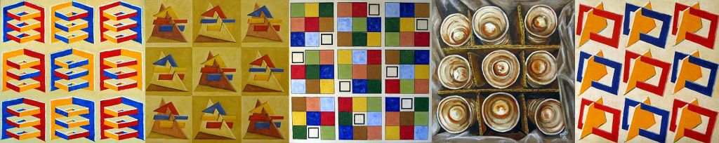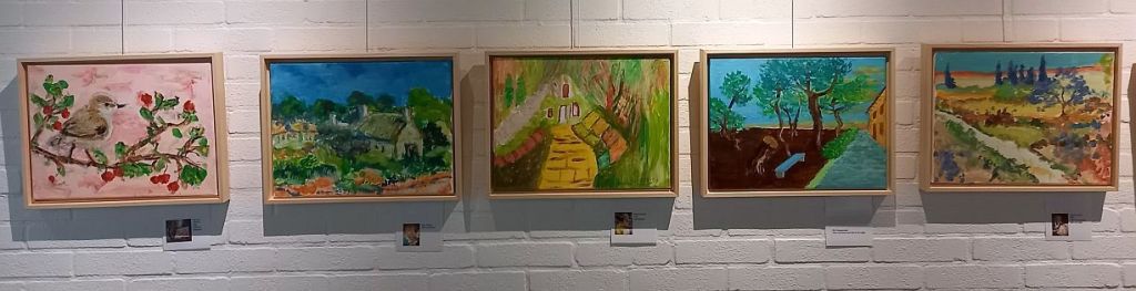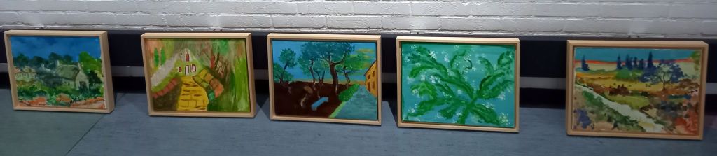 De andere resultaten zijn ‘gewoon’ acryl-schilderijtjes op mdf-paneeltjes, op die van opdracht 1 na: dat was een experiment met schilderen op schuurpapier. Dat vind ik niet voor herhaling vatbaar. In mijn landschapjes (35×25) van opdracht 5 is helaas niets terug te vinden van de beoogde sfeervolle stijl van Rachel Arif, dat heb ik kennelijk niet in me.