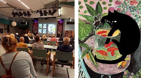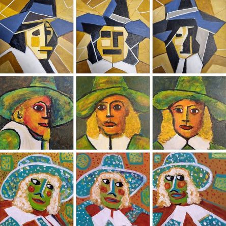 De meest productieve en inspirerende opdracht was nummer 7, met De Staalmeesters van Rembrandt als uitgangspunt. Daarover schreef ik al eerder een blog, toen de resultaten van onze groep in april in de bibliotheek te zien waren. Deze opdracht heb ik op allerlei manieren verder uitgewerkt en het wordt waarschijnlijk het thema van mijn kalender voor 2026.