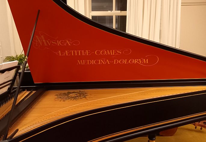 Toevallig was ik kort daarna bij een concert waar klavecimbel werd gespeeld, en tot mijn verbazing stond op het deksel daarvan dezelfde tekst. Ik had wel vaker prachtig gedecoreerde klavecimbels gezien waarvan het deksel fraai beschilderd was, maar zo’n tekst was nieuw voor me.