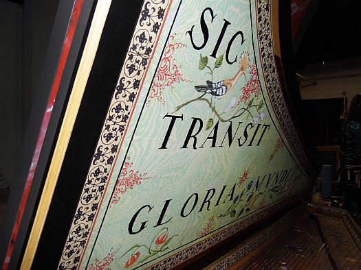 In hoeverre was zo’n tekst op een klavecimbel gebruikelijk? Op de cursus Filosofie en Kunst in Oost-Europa waar ik vorige week ben geweest, vroeg ik dat aan een daar aanwezige musicoloog. Behalve de fraaie beschildering waarmee mensen toonden hoe welgesteld ze waren, lieten ze er regelmatig stichtelijke (bijbel)-teksten op zetten, zoals Sic transit gloria mundi (zo vergaat de roem der wereld). Op deze instrumenten werd immers vooral wereldlijke muziek gespeeld en dit werd geacht de mensen een beetje in het gareel te houden.