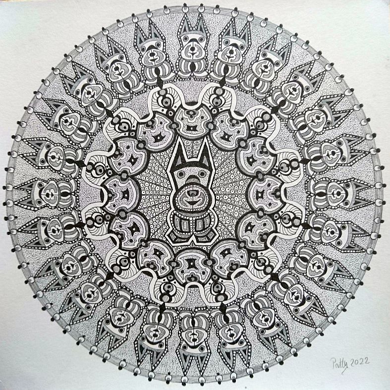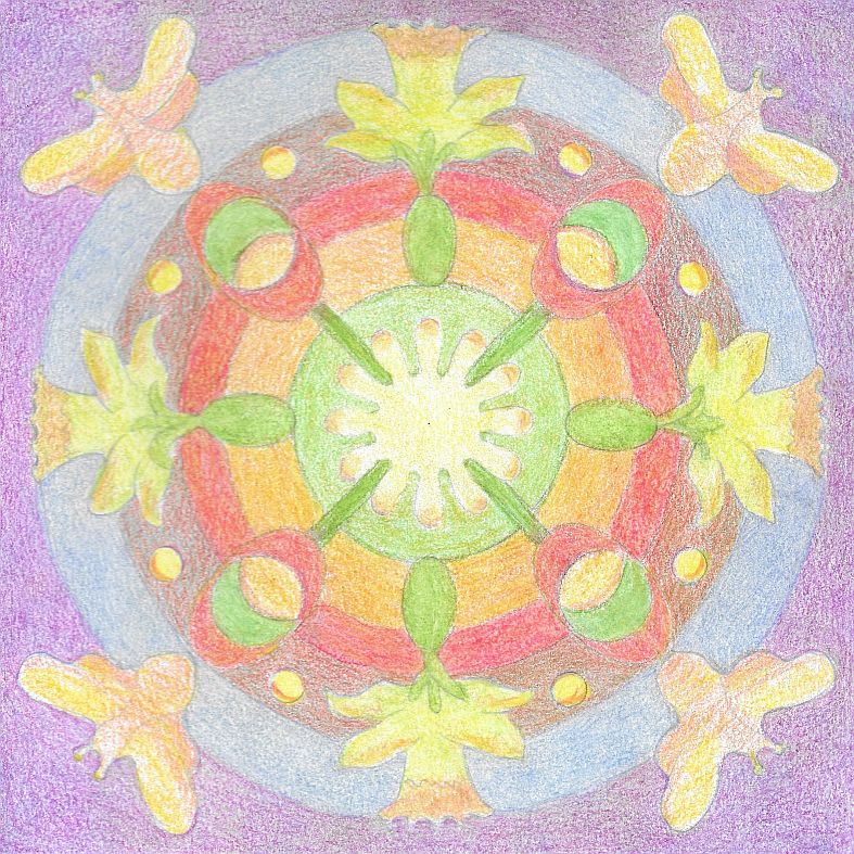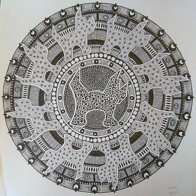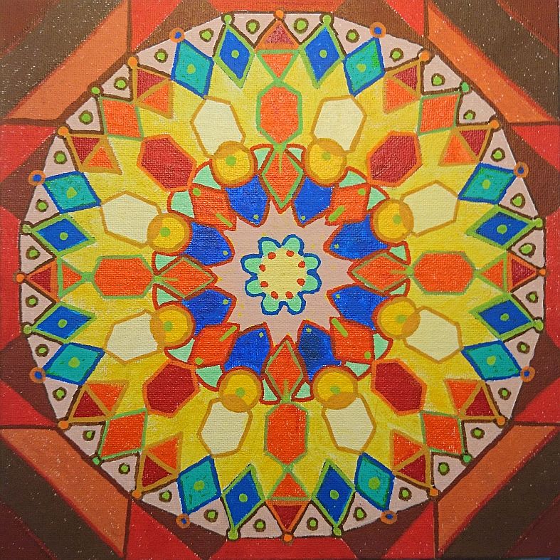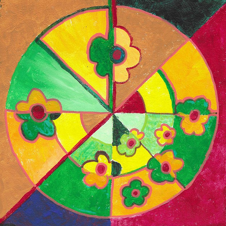 In 2022 kwamen de mandala’s op mijn pad. Daarover heb ik op 25 maart 2022 een blogstukje geschreven. Het werken met een cirkel in plaats van een vierkant beviel me en sindsdien workshop maak ik regelmatig een mandala. Al is het eigenlijk een combinatie met een tegel, want die cirkel staat in een vierkant.
